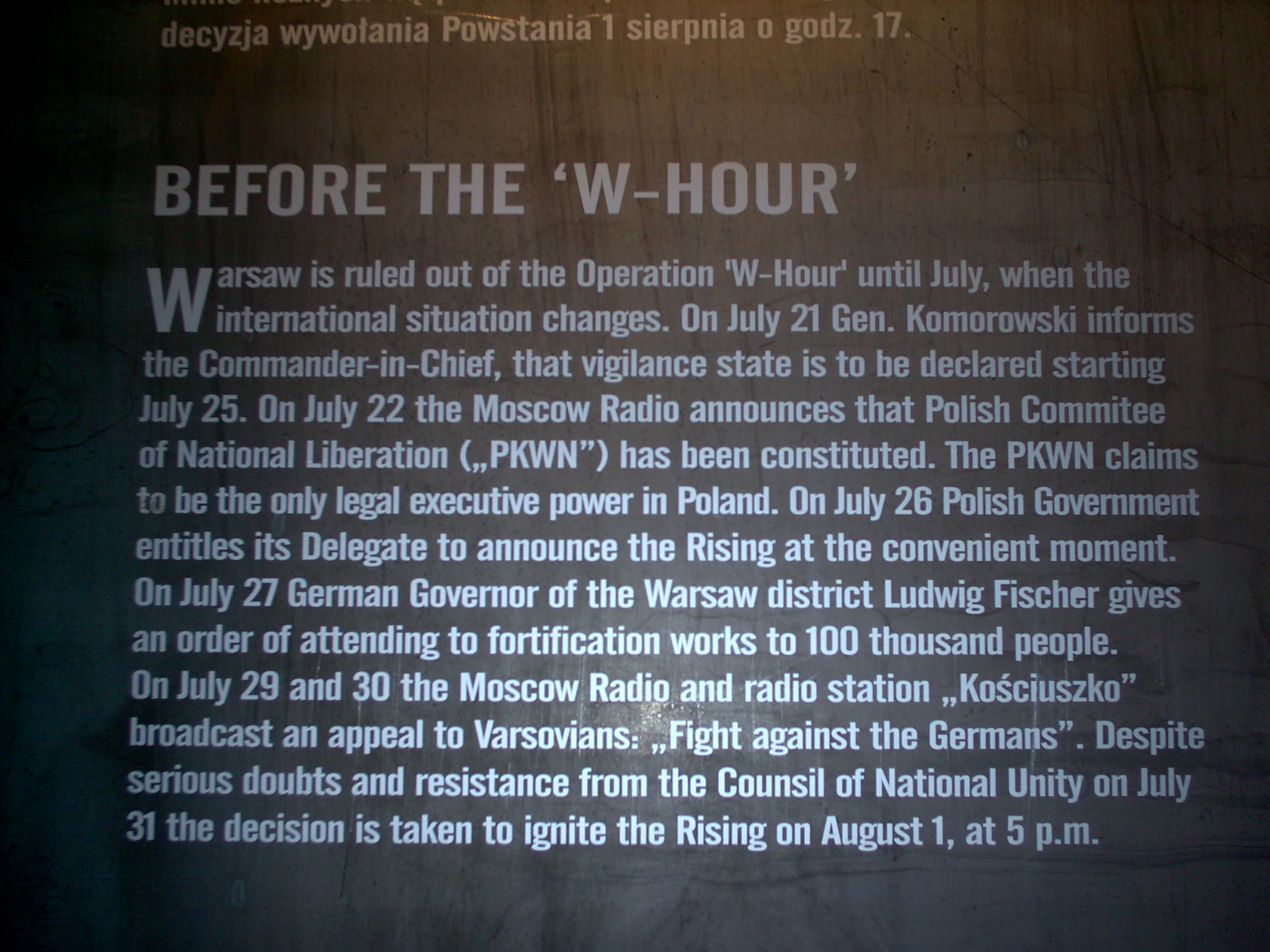 Photo taken by me on Saturday 09th October 2004 at the Warsaw Rising Museum of the tablet documenting Moscow radio station “Kosciuszko” broadcasting an appeal to Varsovians to “Fight against the Germans”, virtually compelling the decision by Tadeusz Bór Komorowski, Commander-in-Chief of the Home Army, to invoke the Rising on August 1st 1944 at 17:00 hours.