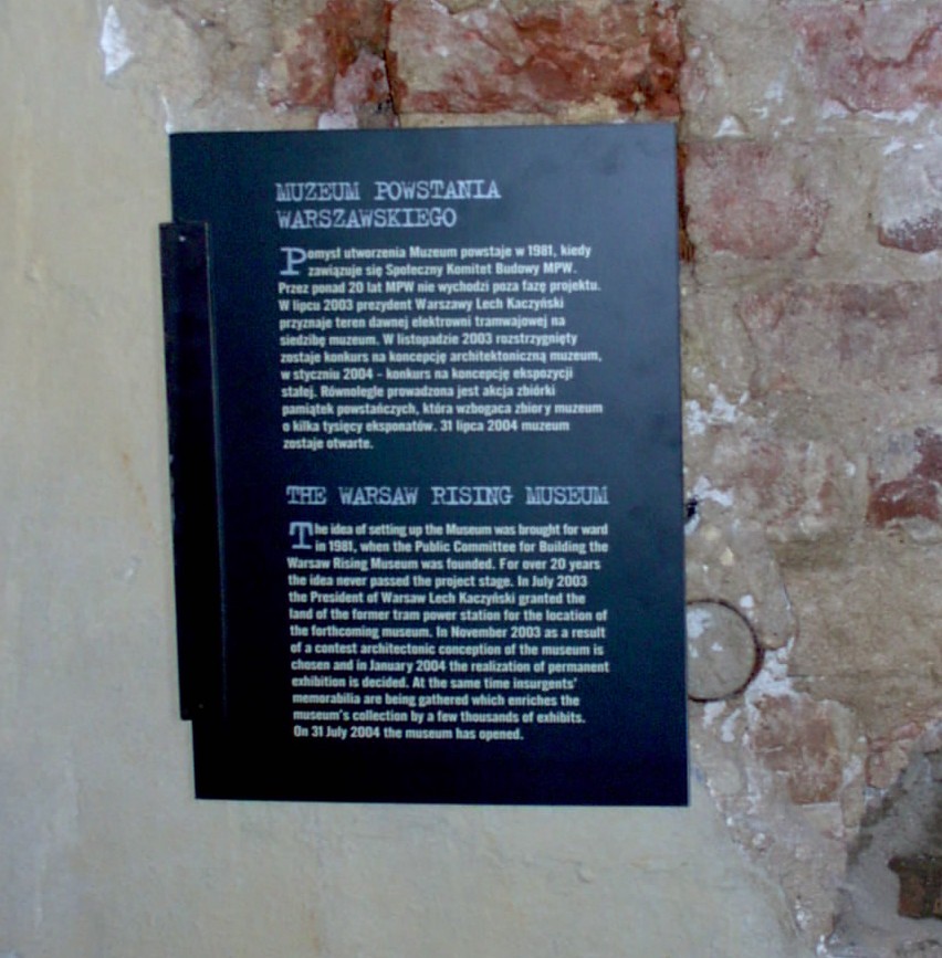 Photo taken by me on Saturday 09th October 2004 at the Warsaw Rising Museum of the tablet documenting its founding on 31st July 2004, just over two months before my visit.